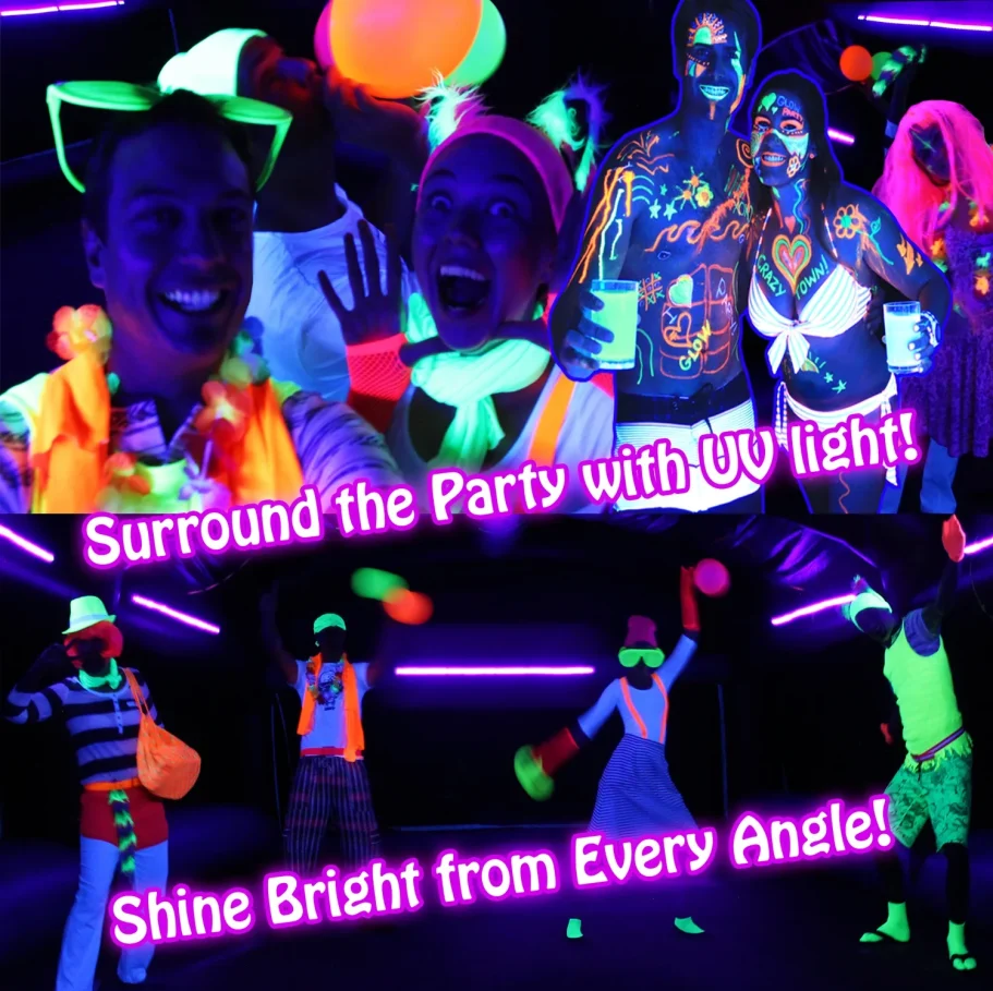 We can create a magical Glowing wonderland. Perfect for Birthdays, Graduations, Halloween Parties, School Events, Photoshoots, Festivals, or any event. Turn them into a glowing wonderland with UV light.